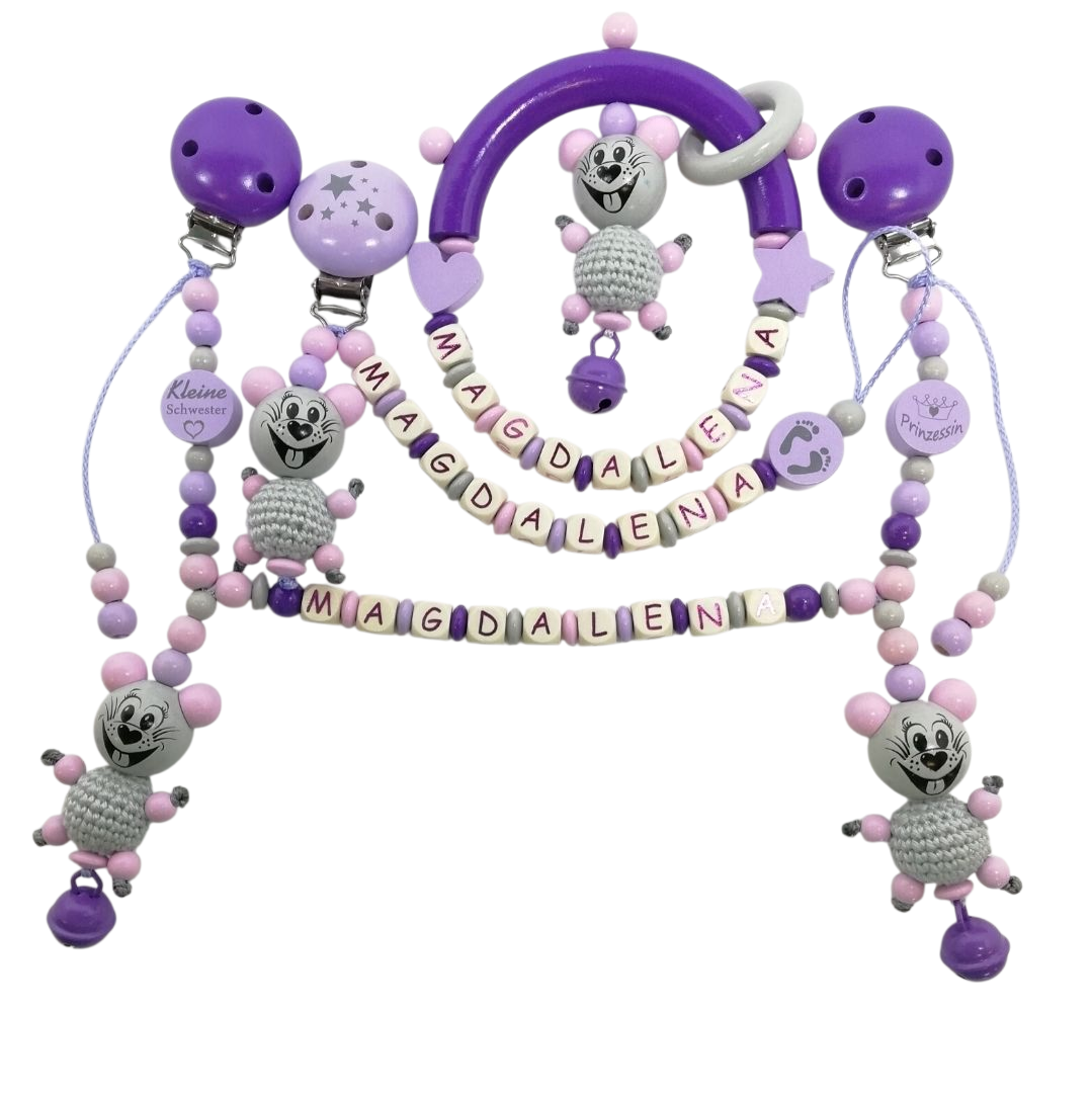 Geschenkbox Greifling + Schnullerkette + Kinderwagenkette Flieder *Häkelmäuschen*