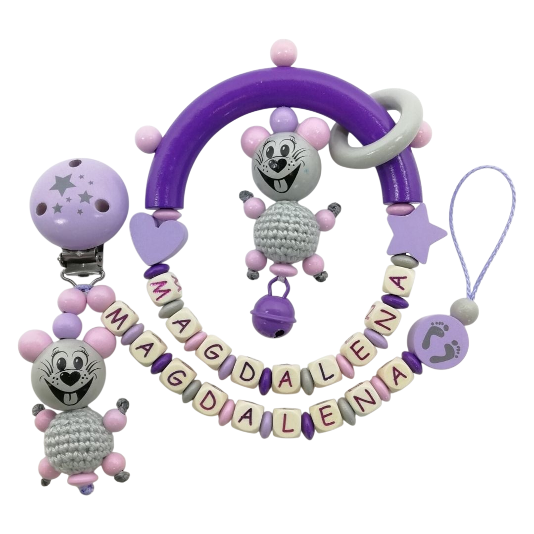 Greifling mit 1 x Glöckchen 15 mm, 1 x Miniring und 2 x Motivperle und Häkelmäuschen Schnullerkette mit Motivclip, 1 x Motivperle und Häkelmäuschen