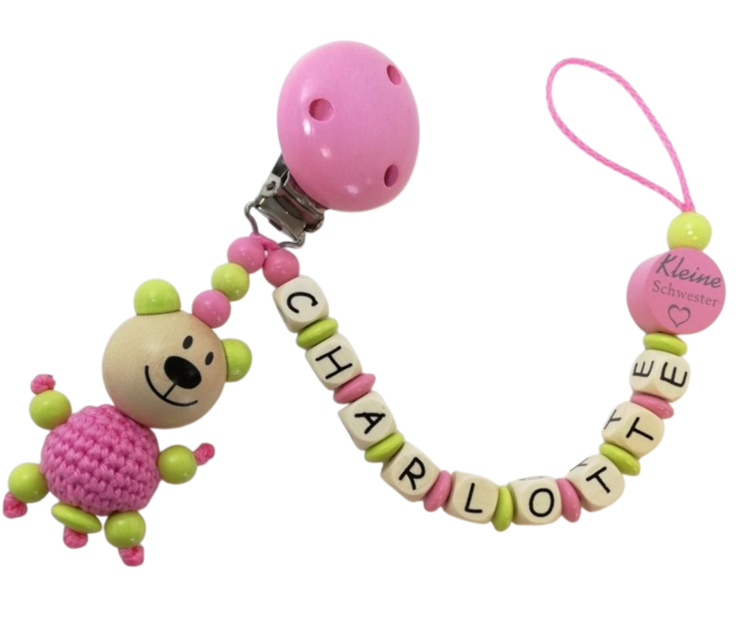 Schnullerkette mit Häkelteddy ACHTUNG: Motiv KLEINE SCHWESTER (kann gerne gegen ein anderes getauscht werden!)