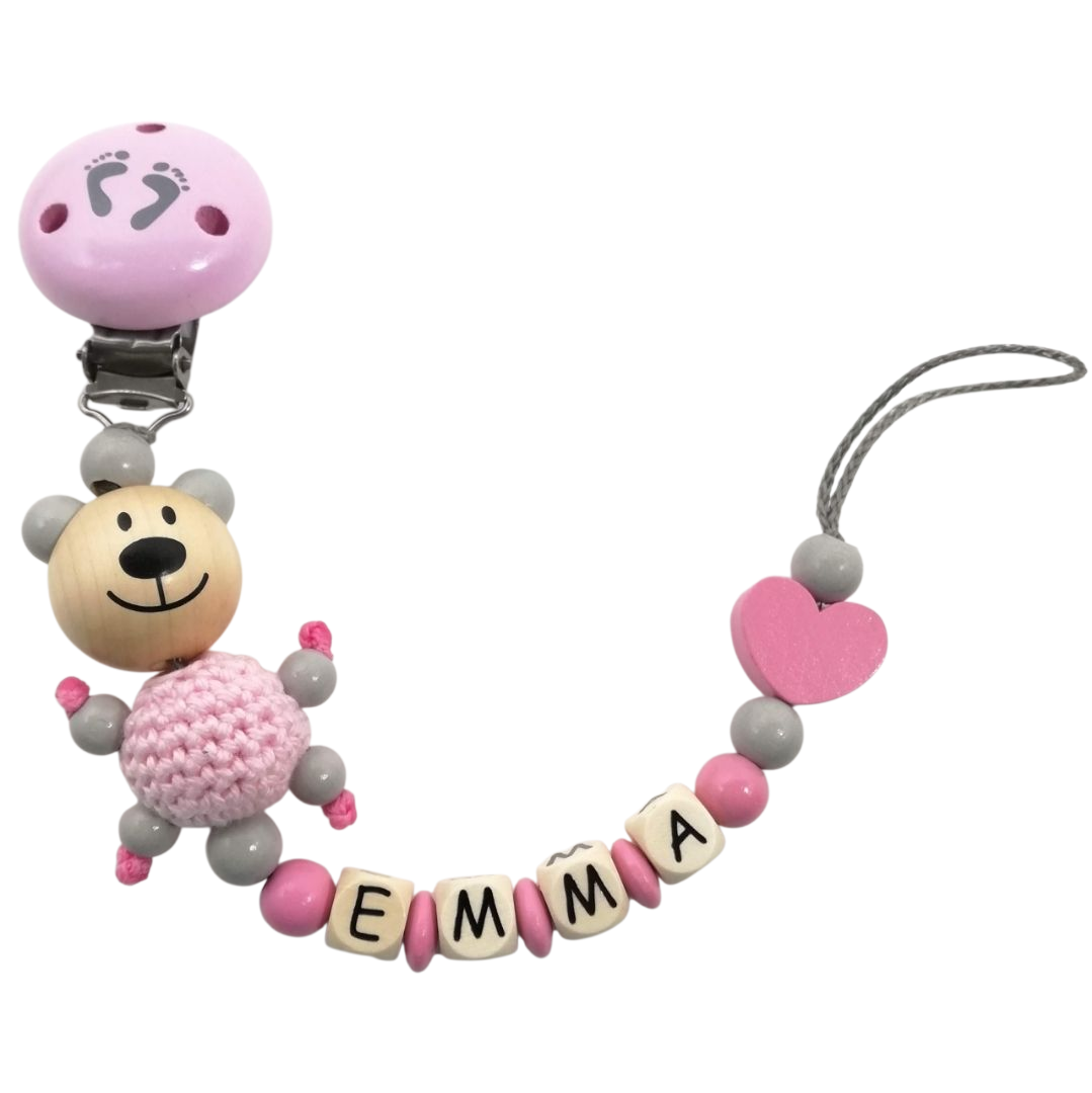 Schnullerkette mit Häkelteddy – je nach Länge des Namens kann sich das Produkt vom Vorschaubild unterscheiden. Bitte für Schnuller ohne Bügel einen Silikonring dazubestellen.