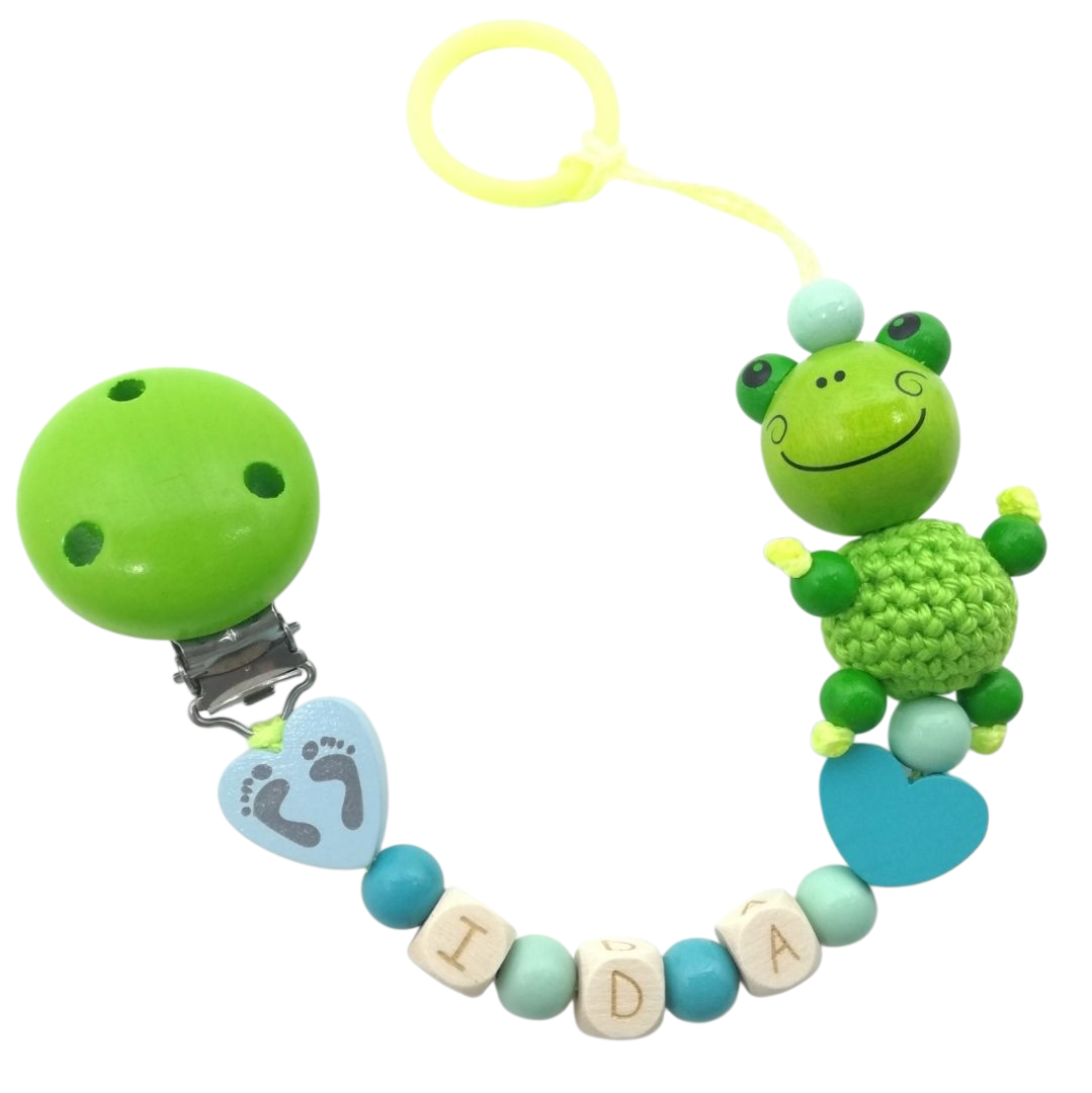Schnullerkette mit Häkelfrosch Je nach Länge des Namen, kann die Schnullerkette vom Bild abweichen.