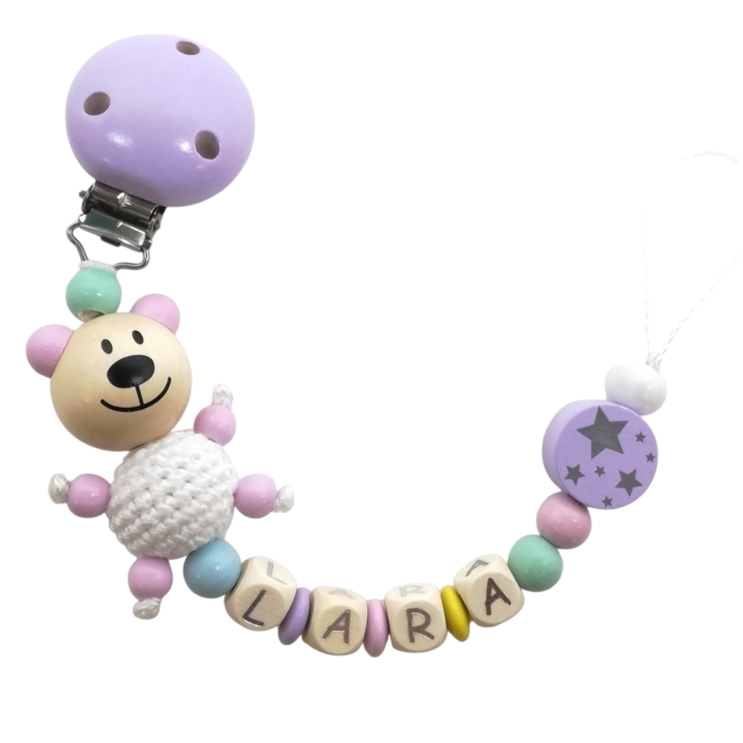 Schnullerkette mit Häkelteddy Je nach Länge des Namens kann die Schnullerkette vom Beispielbild abweichen.