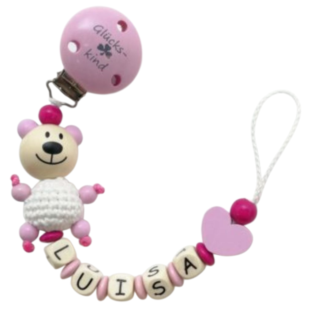 Schnullerkette mit süßem Häkel-Teddy Sollte der Name länger als 5 Buchstaben sein, muss der Teddy extra gehängt werden.