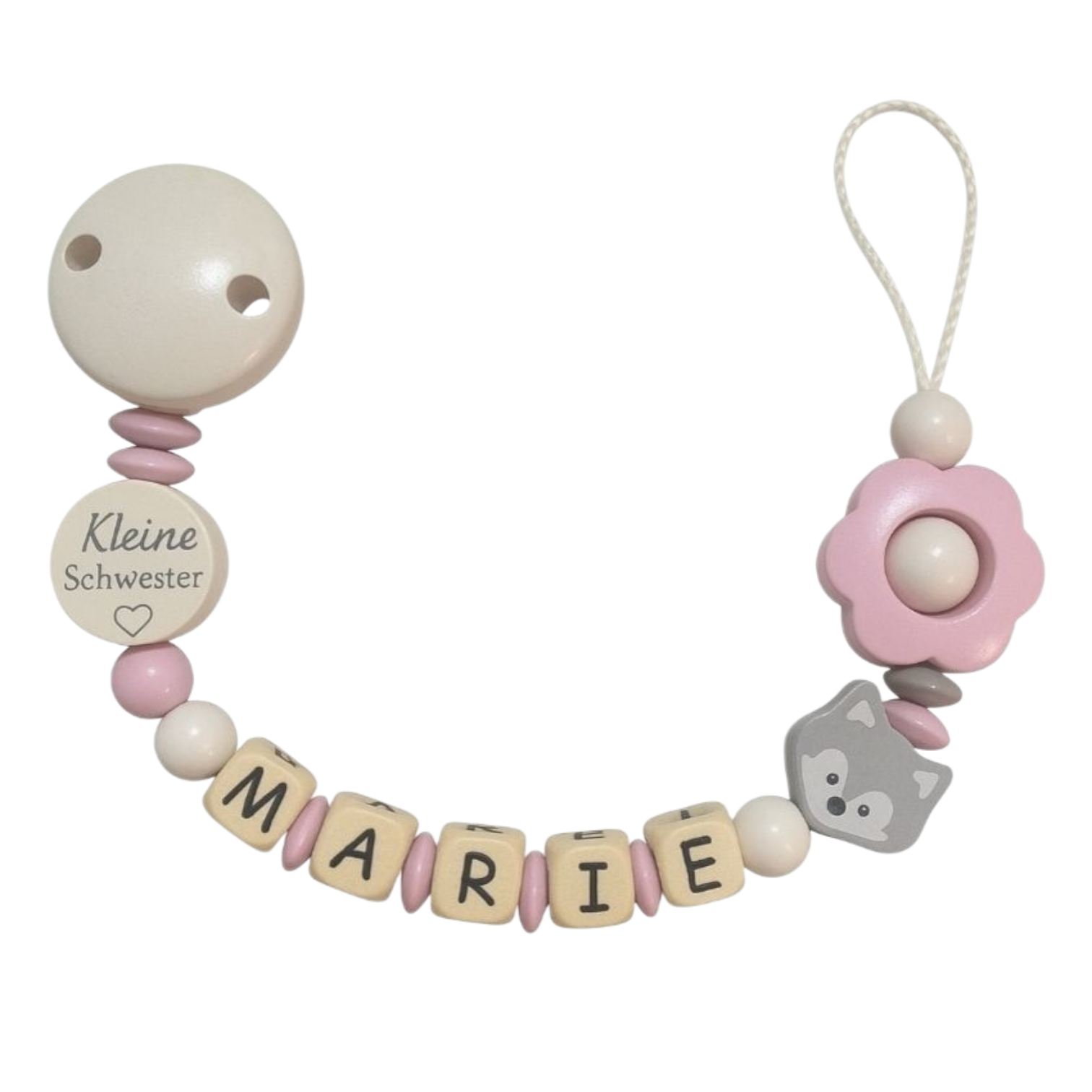 Schnullerkette mit dem Motiv KLEINE SCHWESTER Sollte dieses Motiv unpassend sein, kann es gerne gegen ein anderes getauscht werden. Je nach Länge des Namens kann die Schnullerkette vom Beispielbild abweichen.