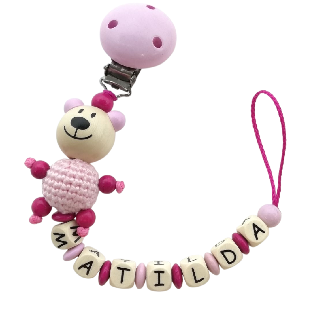 Schnullerkette mit süßem Häkel-Teddy Sollte der Name länger als 7 Buchstaben sein, muss der Teddy extra gehängt werden.