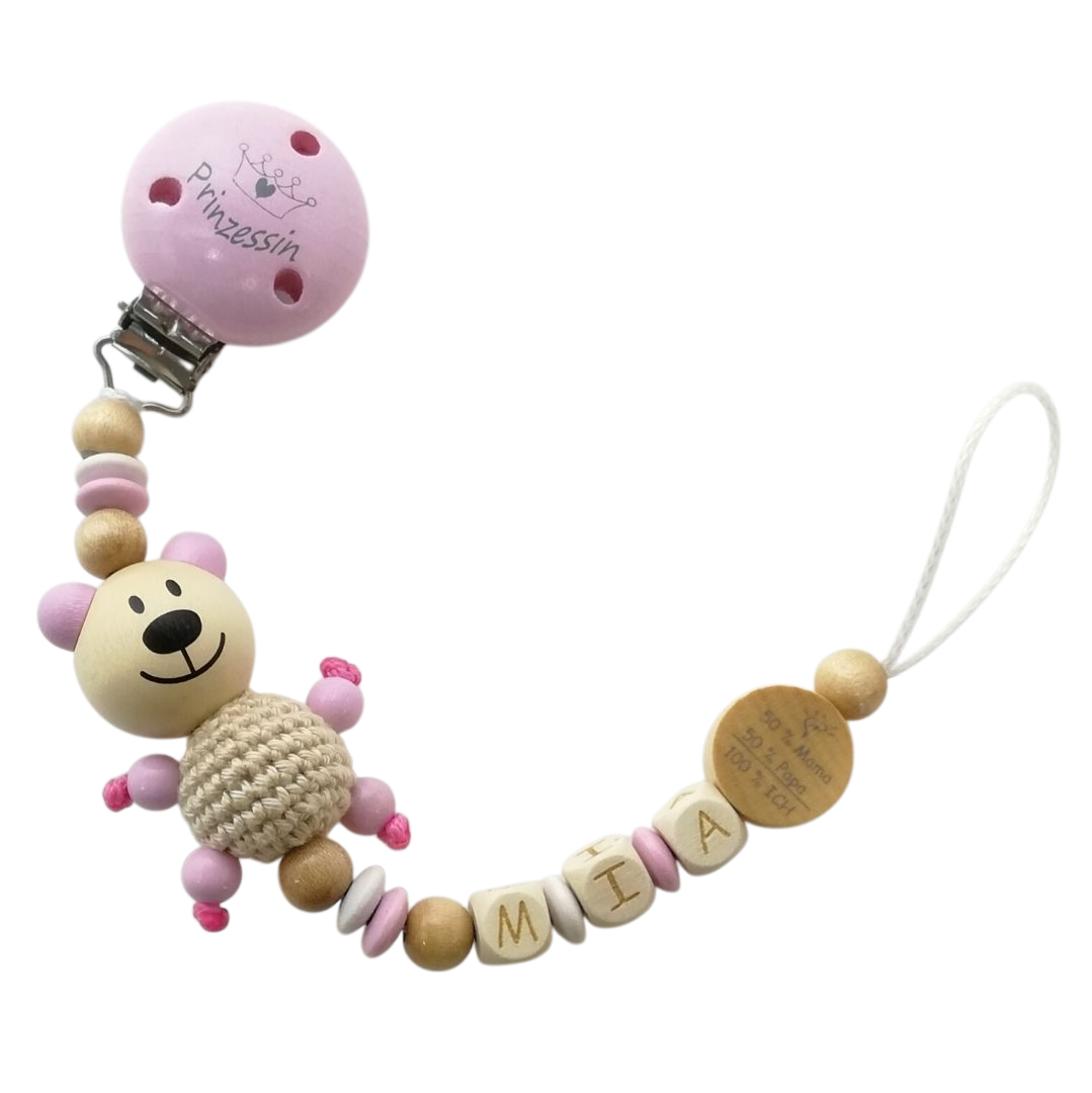Schnullerkette mit süßem Häkel-Teddy Je nach Länge des Namens kann die Schnullerkette vom Beispielbild abweichen.