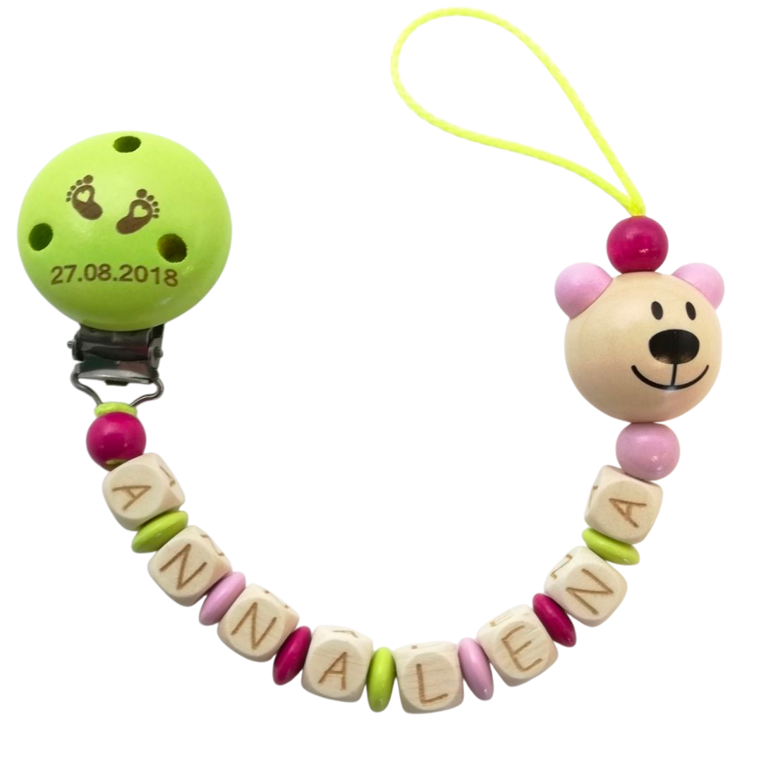 Hier habt ihr die Möglichkeit euch eine Schnullerkette mit den Geburtsdaten herstellen zu lassen. Mittels hochwertiger Lasergravur werden die Daten dauerhaft eingebrannt, daher gibt es bei diesem Verfahren kein Ablösen der Schrift und verspricht somit eine lebenslange Haltbarkeit.