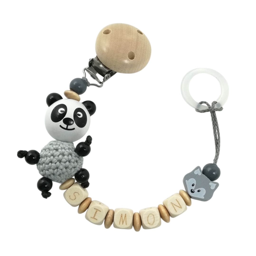 Je nach Länge des Namens kan die Schnullerkette vom Beispielbild abweichen. Am Bild wurden Laserbuchstaben verwendet.